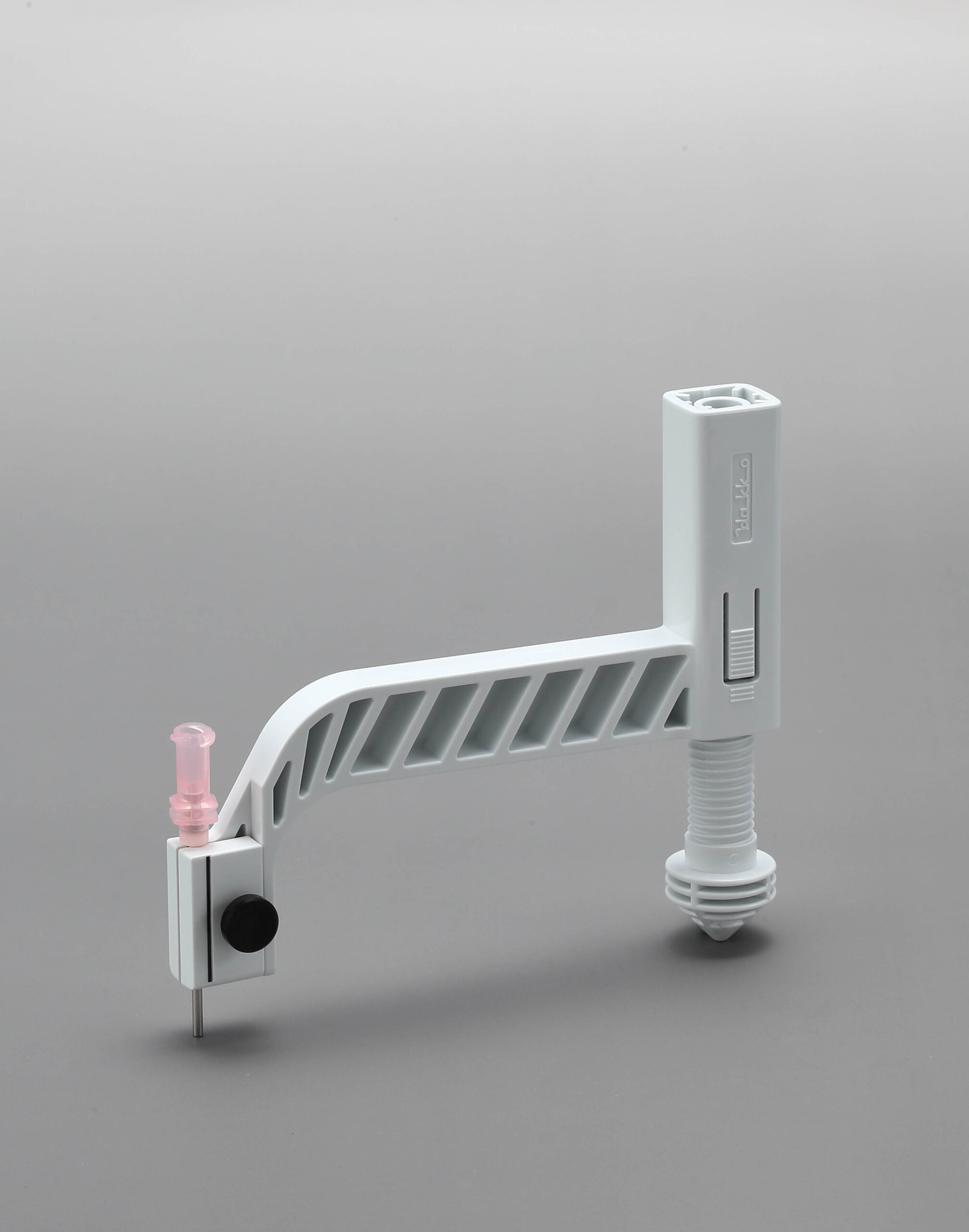 CT透視ガイド下における穿刺を正確・安全・迅速に施行するための補助デバイスです。 CT透視ガイド下に穿刺をする際に術者の手の直接被曝を最小限にすることができます。 CT透視画像上で容易に目標部位を捕らえ、正式な穿刺が可能です。